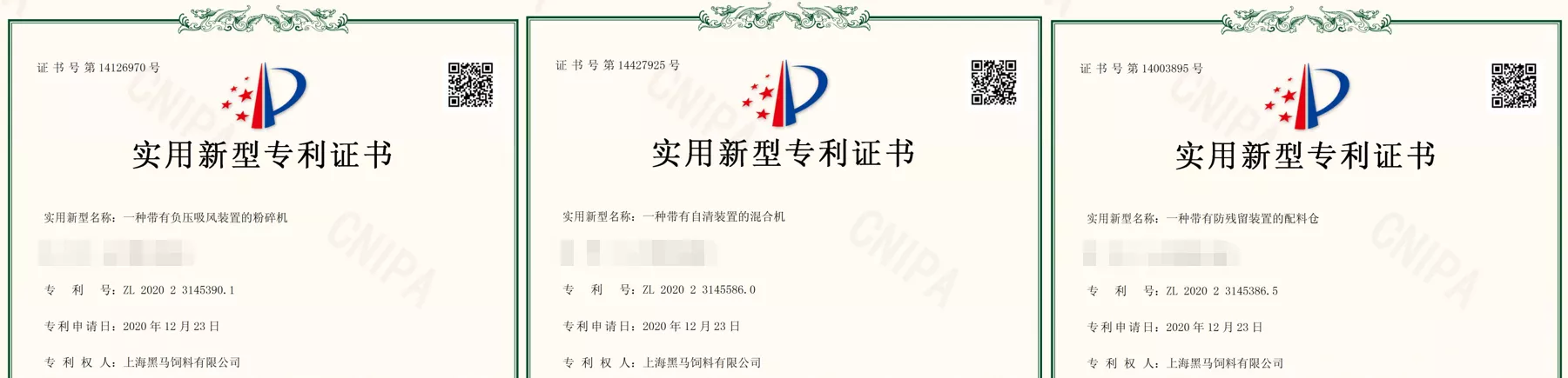 其中的核心設備混合機、粉碎機和配料稱被國家知識產權局授予專利。